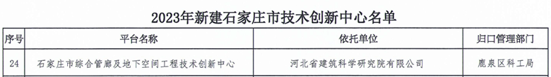 近日,石家莊市科學技術局下發《關于2023年新建市級技術創新中心的通知》,公布了2023年石家莊市技術創新中心獲批名單。其中,由河北省建筑科學研究院有限公司牽頭,河北省建筑工程質量檢測中心有限公司、石家莊市城投建設開發有限公司共同申報的“石家莊市綜合管廊及地下空間工程技術創新中心”(以下簡稱“中心”)獲批,該中心是我院在地下空間領域首個市級技術創新中心,也是我院科研創新平臺建設的又一新突破。